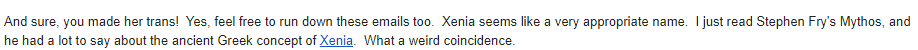 As it happens, Xenia (a name chosen by Cathodegaytube's girlfriend, AmyWrightDev), became a girl off-screen and came out during pride month.